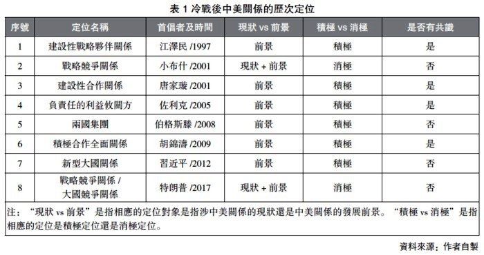 從上述梳理可知,冷戰後中美至少對雙邊關係做了八次定位(見表1)。單從時間上看,這些定位有先後繼承的關係。但從邏輯上看,它們反映了中美關係跌宕起伏的發展歷程。當然,這些定位主要由兩國官方做出,衹有“兩國集團”定位由美方學界首倡並引發較多討論。筆者迄今未看到兩國學界對中美關係的其他定位。深入分析上述八次定位的過程與內涵,可以找到一些規律與特徵,對於我們理解冷戰後中美關係的歷史、現狀及未來走向都具有重要參考意義。