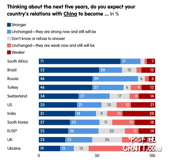 民調顯示,人們普遍預期本國與中國的關係將在未來五年內得到加強:南非(71%)和巴西(52%)的大多數民眾持此觀點,俄羅斯(46%)和土耳其(46%)也有許多人持相同看法。連美國也有33%的人預期美中關係會增強,21%的美國人相信會減弱。研究者表示,這些調查結果似乎表明,從全球大部分民眾的角度來看,多極秩序與“中國優先”的世界觀完全契合。事實上,中國的崛起被大多數非西方國家的民眾視為一種有利因素。大多數人似乎都希望“後美國時代”能夠擺脫霸權主義的束縛。
