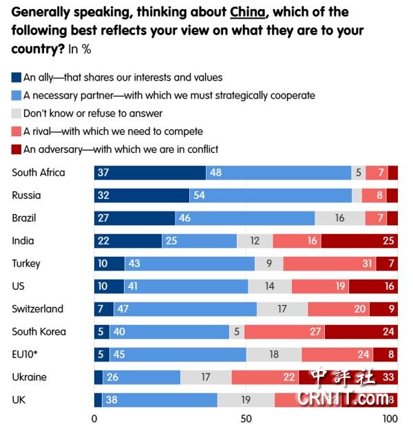 民調發現,不僅越來越多的人認為中國在地緣政治上正在崛起,並在重要產業中處於領先地位,而且少有人對此感到擔憂。衹有烏克蘭和韓國的多數人將中國視為競爭對手或敵對勢力,其他9國和歐洲10國整體大多數人都視中國為盟友或必要合作夥伴。去年以來,在南非和巴西,更多人將中國視為盟友。這種轉變在印度更為顯著。儘管新德里和北京之間的關係歷來緊張,仍有近一半的印度人將中國視為盟友或必要合作夥伴。